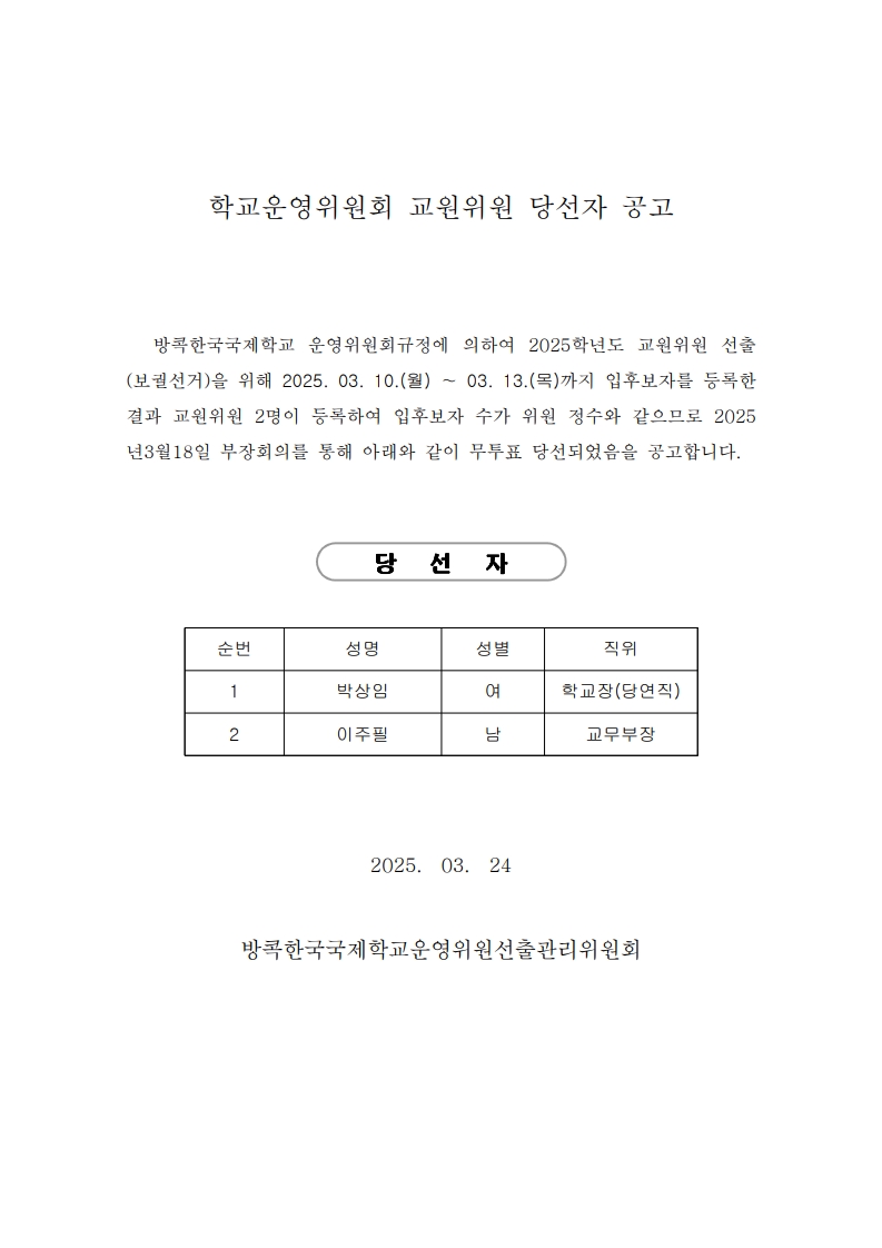 2025학년도 학교운영위원회 교원위원 당선자 공고